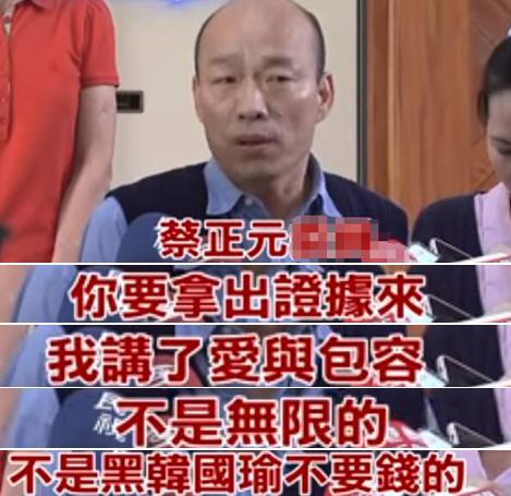 韓國瑜怒嗆蔡正元,要他“拿出證據(jù)來”;還表示,如果自己真的有拿這么多錢,那就——辭掉高雄市長職務(wù)!