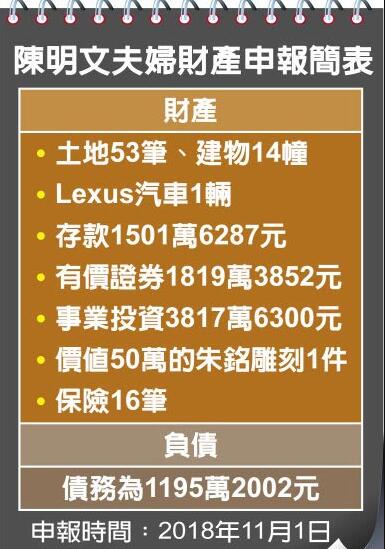 其中,光是土地,陳明文夫妻就有遍及臺北市、臺中市、嘉義市、嘉義縣等縣市數十筆,土地總計登記持有4萬1千多平方公尺!而在事業投資部分,總金額高達3800多萬元的財產中,遍及開發、建設、投資公司等,地點則是遍布新北市、臺中市、嘉義縣、市等。