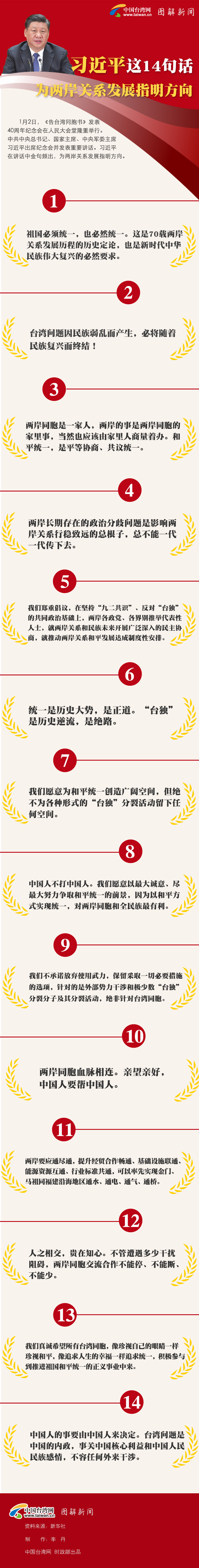 1月2日,《告臺灣同胞書》發表40周年紀念會在人民大會堂隆重舉行。中共中央總書記、國家主席、中央軍委主席習近平出席紀念會并發表重要講話。習近平在講話中金句頻出,為兩岸關系發展指明方向。