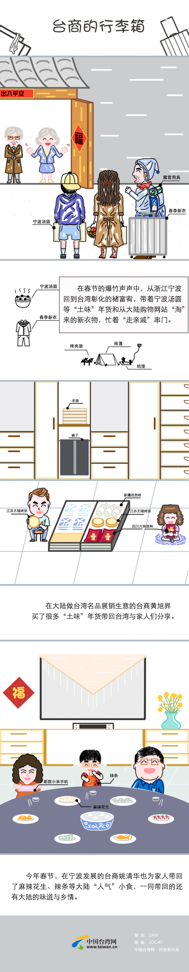 春節(jié)期間,在陸臺(tái)商紛紛跨越淺淺的一灣海峽,返回臺(tái)灣過年。而在他們的“年貨禮包”中,既有“舌尖上”的大陸傳統(tǒng)美食,也有與時(shí)俱進(jìn)的“觸網(wǎng)”新配方。這些琳瑯多元的年貨,折射出兩岸交流的日益緊密,以及“兩岸一家親”的情感融合。