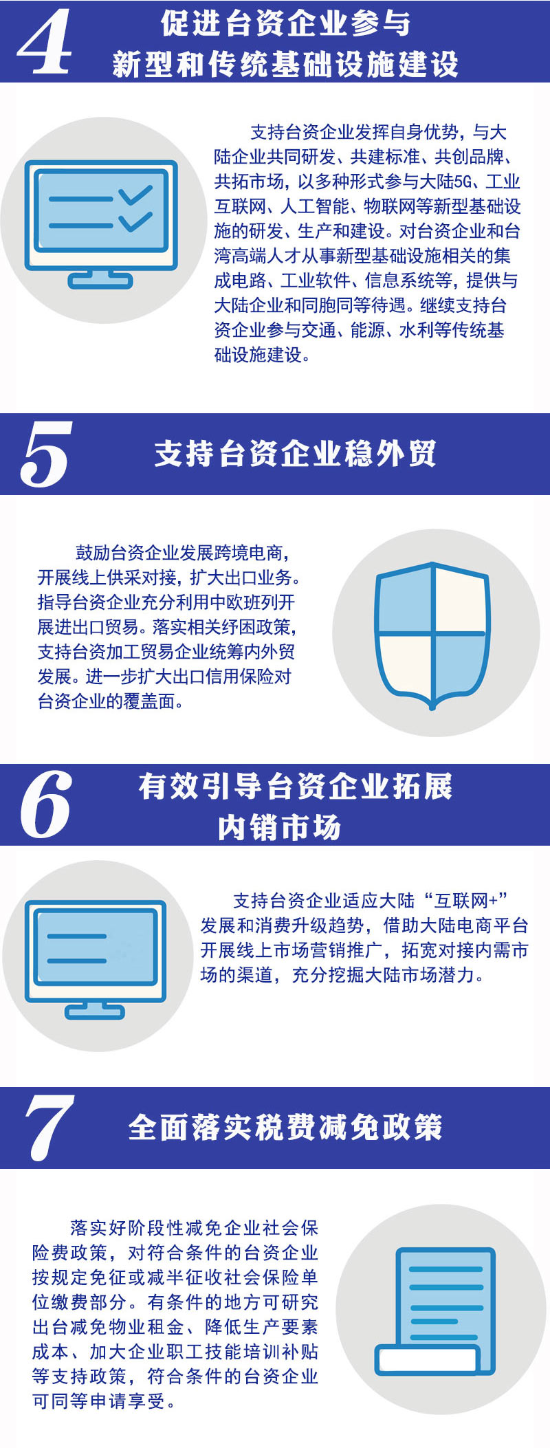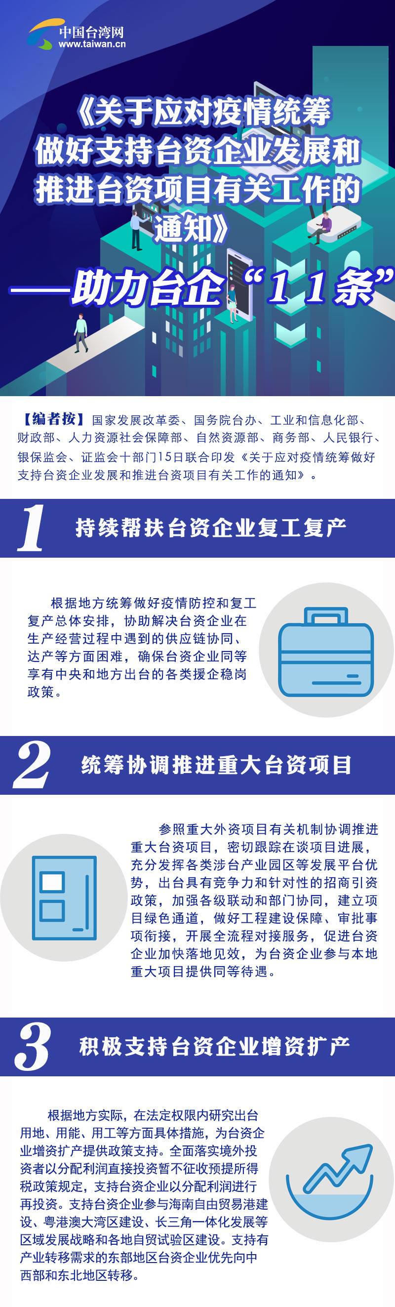 15日,國家發(fā)展改革委、國務(wù)院臺(tái)辦、工業(yè)和信息化部等十部門聯(lián)合印發(fā)了助力臺(tái)企“11條措施”。相關(guān)措施將進(jìn)一步幫助廣大臺(tái)商臺(tái)企應(yīng)對(duì)疫情和復(fù)工復(fù)產(chǎn),為臺(tái)商臺(tái)企提供更多發(fā)展機(jī)遇、同等待遇,對(duì)臺(tái)商臺(tái)企在大陸投資興業(yè)給予更有力支持。