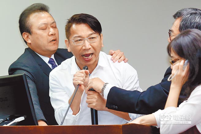 徐永明(中)占據(jù)質(zhì)詢臺(tái)要求復(fù)議期過(guò)后才初審,持續(xù)僵持不下,民進(jìn)黨“立委”蘇震清(左)與陳明文(右)上臺(tái)軟性規(guī)勸,依舊無(wú)法順利開會(huì),晚間蘇、陳兩人合力把徐永明架出議場(chǎng)外。(圖片來(lái)源:《中時(shí)電子報(bào)》)