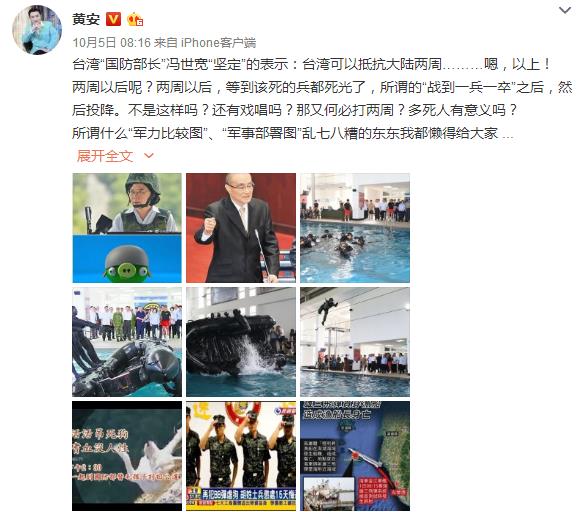 對此,向來關注兩岸動態的黃安在微博上發表看法,他寫道,兩周以后,等到該死的兵都死光了,所謂的“戰到一兵一卒”之后,然后投降。不是這樣嗎?還有戲唱嗎?那又何必打兩周?多死人有意義嗎?