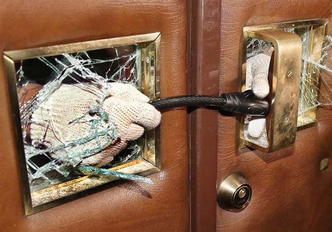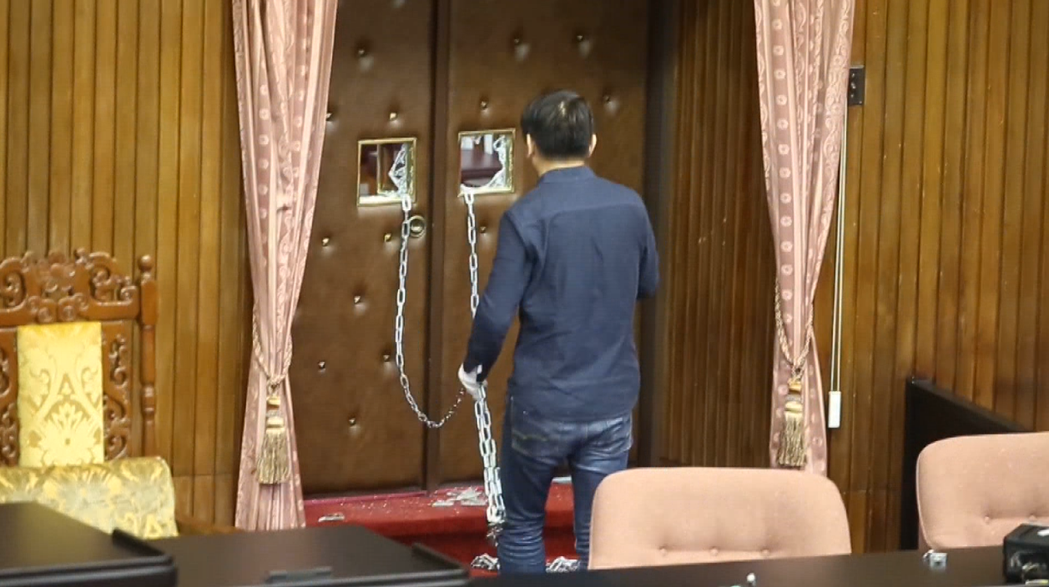 徐永明敲破議場門口玻璃“突襲”后,以鐵鏈反鎖。(圖片來源:臺灣《聯合報》)
