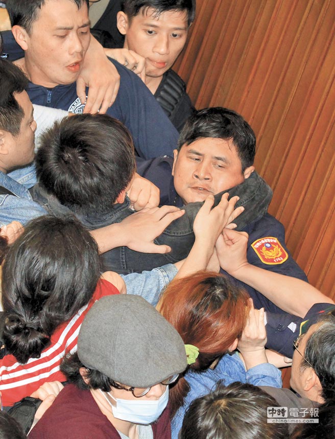 圖為當(dāng)年身著制服的警察被民眾拉扯出議場。(圖片來源:臺灣《中時電子報》)