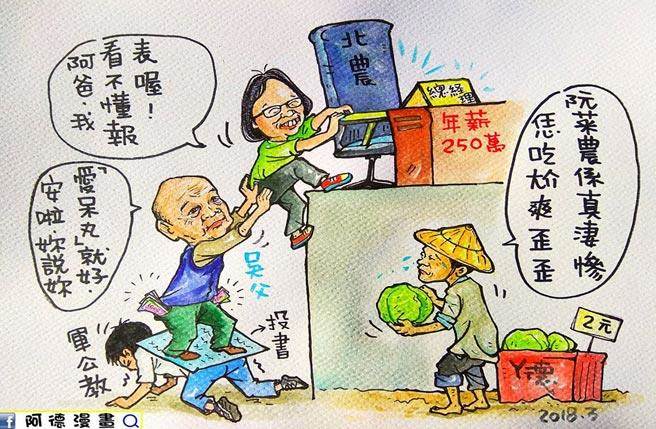 對此,有網友貼出一張插畫狂酸。據《中時電子報》報道,畫中“吳父”踩著跪在地上的軍公教,將女兒推上年薪250萬的北農總經理位置,女兒說“阿爸,我看不懂報表喔”,阿爸則回她“安啦!你說你‘愛呆丸’就好…”;而一旁手捧2元高麗菜的農民則在飆淚。網友紛紛留言,“老爸干掉軍公教,女兒干倒果菜農,一門豪杰!”“資歷不可靠,買衣服選綠色的就對了!”