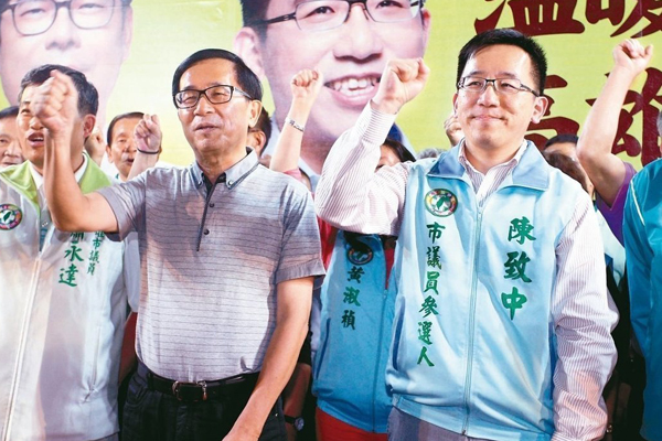 陳水扁參加兒子陳致中的選舉造勢晚會。(圖片來源:臺灣《聯合報》)