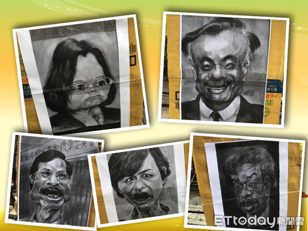 八百壯士號召群眾到“立法院”外抗議,并列出年改“5大惡人”扭曲肖像。(圖片來源:臺灣“東森新聞云”)
