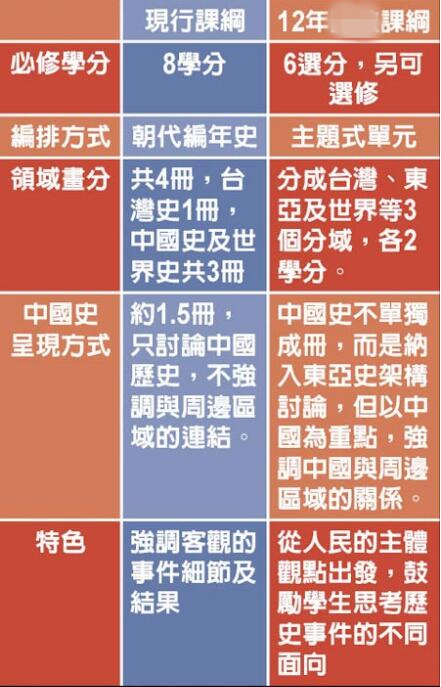 臺灣現(xiàn)行的高中歷史課綱分成臺灣史、中國史及世界史等3部分,明年上路的12年義務(wù)教育課綱(即新課綱)則改為臺灣史、東亞史及世界史,將“中國史納入東亞史的架構(gòu)下討論”,中國史不再單獨(dú)存在。