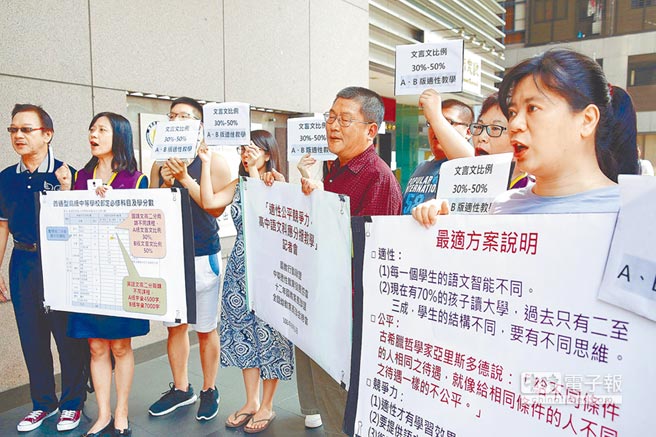 2017年臺“教育部”召開語文課綱審議會,有團(tuán)體在場外抗議,高呼“文言文比率30到50%!”(圖片來源:臺灣《中時電子報(bào)》)