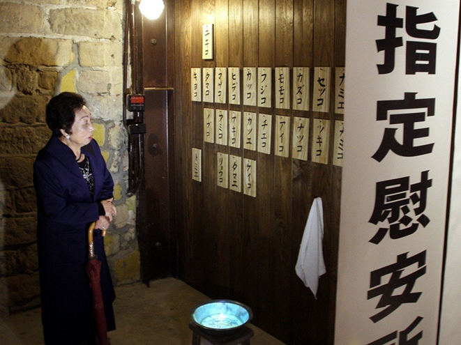 陳蓮花阿嬤二次大戰期間遭拐騙成慰安婦,曾參觀“慰安婦展覽”,望著墻上掛著慰安婦名牌的模擬慰安所。(圖片來源:臺灣《聯合報》)