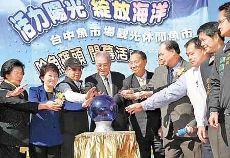 臺中魚市場“哈魚碼頭”,昨日正式啟用,臺當局“行政院長”吳敦義、臺中市長胡志強,及臺中魚市場董事長林仁德等人,共同主持開幕儀式。圖片來源:臺灣《工商時報》