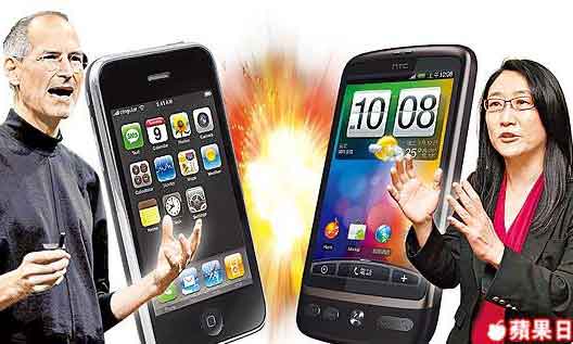 宏達(dá)電控蘋果侵犯五項(xiàng)專利。右為宏達(dá)電董事長王雪紅,左為蘋果執(zhí)行長喬布斯。圖片來源:臺(tái)灣《蘋果日?qǐng)?bào)》