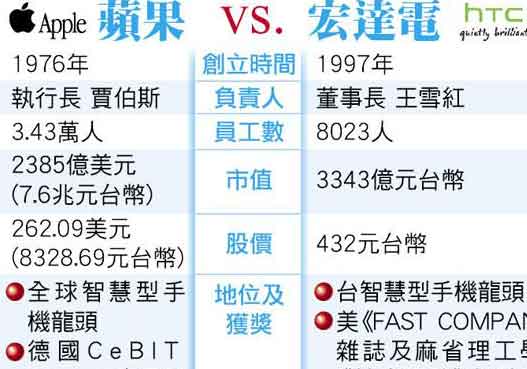 報(bào)道指出,蘋果公司目前市值為宏達(dá)電的23倍,這起控訴儼然小蝦米對(duì)大鯨魚的專利權(quán)大戰(zhàn)!臺(tái)當(dāng)局“經(jīng)濟(jì)部知識(shí)財(cái)產(chǎn)局局長”王美花昨指此案具“重大指標(biāo)意義”,宏達(dá)電這一步全世界都在看。