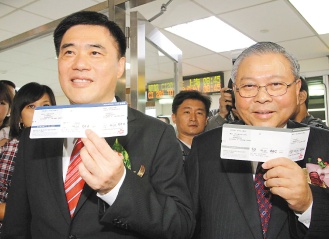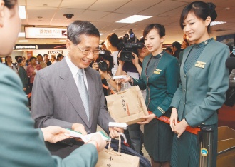 臺(tái)北松山機(jī)場(chǎng)昨天上午首航上海虹橋機(jī)場(chǎng),由華航搶得頭香,臺(tái)北市長(zhǎng)郝龍斌(左)與華航董事長(zhǎng)魏幸雄(右)搭乘首航機(jī),見證兩岸直航新的里程碑。來(lái)源:臺(tái)灣《聯(lián)合報(bào)》