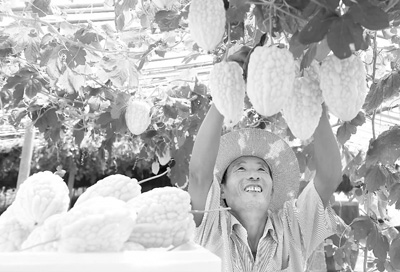 在臺灣農(nóng)業(yè)專家指導(dǎo)下,2016年山東省臨沂市沂南縣寶島果蔬合作社從臺灣引種的“蘋果苦瓜”喜獲豐收,平均畝產(chǎn)1.2萬斤,每斤售價10元左右。這個新品種苦瓜形如蘋果,晶瑩亮白,苦中帶甜,產(chǎn)品遠銷北京、上海,經(jīng)濟效益非常突出。今冬明春,合作社將擴種到200多畝,帶動更多農(nóng)戶致富。