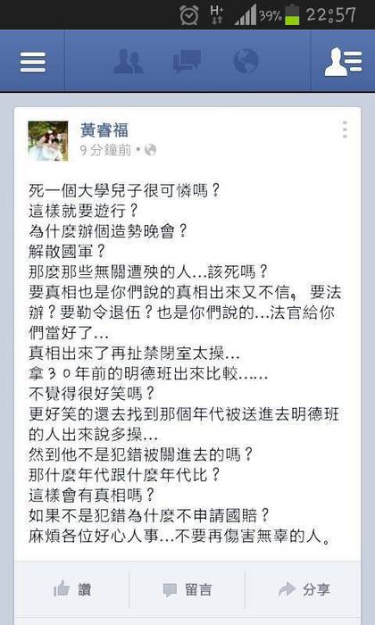 黃睿福po文表示“死一個(gè)大學(xué)兒子很可憐嗎?…要真相也是你們說(shuō)的真相出來(lái)又不信,要法辦?要勒令退伍?也是你們說(shuō)的…法官給你們當(dāng)好了…真相出來(lái)了再扯禁閉室太操…拿30年前的明德班出來(lái)比較:不覺(jué)得很好笑嗎?更好笑的還去找到那個(gè)年代被送進(jìn)去明德班的人出來(lái)說(shuō)多操…然到他不是犯錯(cuò)被關(guān)進(jìn)去的嗎?那什么年代跟什么年代比?這樣會(huì)有真相嗎?如果不是犯錯(cuò)為什么不申請(qǐng)‘國(guó)賠’?麻煩各位好心人事…不要再傷害無(wú)辜的人!