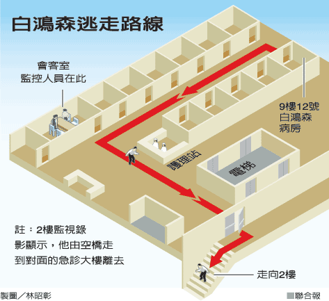 據(jù)悉,前天中午白鴻森還和小女兒共進(jìn)午餐,但兩名警員卻未跟隨在旁,白鴻森趁警員平日松散、疏于戒備,直接從九樓病房走出來,三兩步踱越長廊,走進(jìn)病房正對面的安全梯,拾級而下到二樓,再往門診大樓方向,宛如走自家后院般,一路暢行無阻,揚(yáng)長而去。