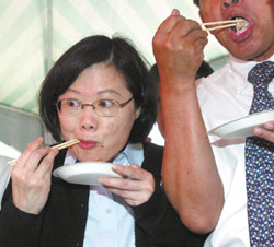 “拜票輕松”:民進黨主席候選人蔡英文(左)2日拜會民進黨“立法院”黨團尋求支持,并參加在臺“立法院”內廣場舉行的恒春洋蔥料理促銷活動,品嘗優質洋蔥料理。(臺灣《中國時報》圖片)