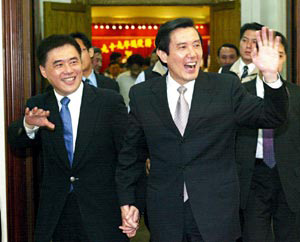 馬英九和臺北市長郝龍斌近日參加臺軍退役將領春節聯誼餐會,把酒言歡后手牽手走出“勝利廳”。圖片來源:臺灣《聯合報》