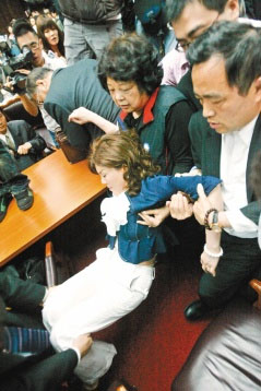 幾番推擠沖突,趙麗云疑似體力不支,昏厥倒地,一旁的國(guó)民黨民代趕緊撐住趙麗云,將趙抬出就醫(yī)。來源:臺(tái)灣《聯(lián)合晚報(bào)》