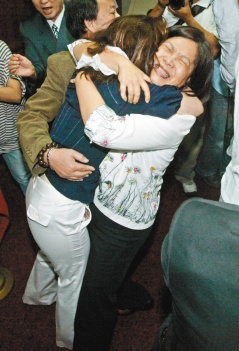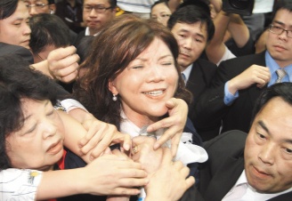 臺“立法院教育及文化委員會”上午排定審查陸生來臺相關“法案”,擔任會議主席的國民黨籍民意代表趙麗云(左)要宣布會議開始,卻被民進黨籍民代管碧玲(右)用力抱住,兩人抱成一團,表情痛苦。圖片來源:臺灣《聯合報》