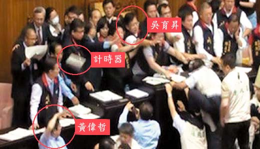 昨晚國民黨團檢視錄像畫面發現,民進黨“立委”黃偉哲扯下定時器后,以一記“勾射”擲向國民黨“立委”,正好砸中吳育升頭部。(臺灣《聯合報》圖)