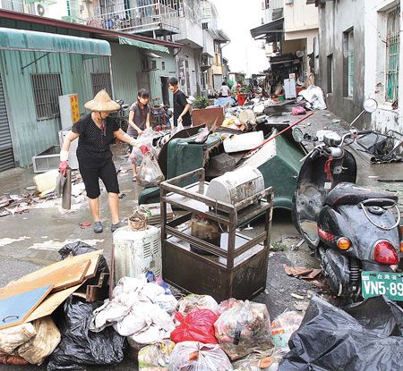 高雄縣梓官鄉部分積水退去,居民忙著清理,街道上堆滿殘破的家具、垃圾。 來源:臺灣《中國時報》