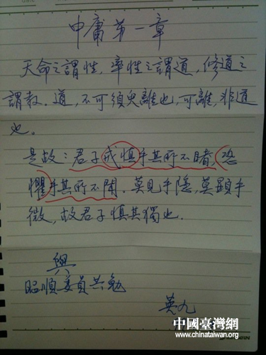馬英九在小紙條上節錄《禮記·中庸》中的開篇名句:“天命之謂性,率性之謂道,修道之謂教。道,不可須臾離也,可離,非道也。是故:君子戒慎乎其所不睹,恐懼乎其所不聞,莫見乎隱,莫顯乎微,故君子慎其獨也。”并用紅筆圈起了“戒慎”與“ 恐懼”兩詞,期待與黃昭順共勉。
