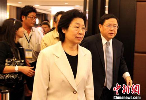 10月27日,大陸海協會副秘書長張勝林等抵達臺灣,了解在臺灣蘇花公路失蹤的20名大陸同胞的搜救進展情況。圖為張勝林(左)下午會見海基會副董事長高孔廉。中新社記者 陳立宇 攝