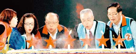 中國臺灣網11月21日消息 據臺灣《中國時報》報道,國民黨116歲生日晚會,昨晚特地移師胡志強競選總部舉行,吸引近萬民眾擠爆會場。國民黨主席馬英九、榮譽主席連戰、副主席江丙坤、臺當局“行政院長”吳敦義、馬英九辦公室秘書長廖了以、前臺中市長林柏榕、彰化縣長卓伯源、南投縣長李朝卿等國民黨重量級人士到場。報道稱,國民黨A咖(大佬)昨晚在臺中大會師,為胡志強沖人氣。