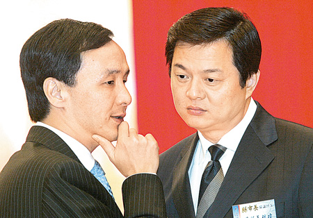 臺北縣長周錫瑋(右)以準(zhǔn)“過來人”經(jīng)驗斷言,臺中、臺南、高雄三市至少會亂一年,新北市由于已有磨合經(jīng)驗,市長朱立倫會比較平順。圖片來源:臺灣《中國時報》