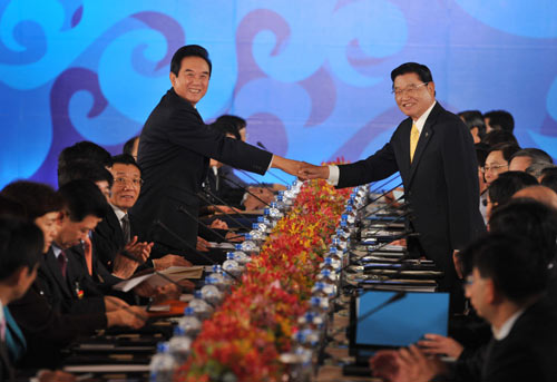 第6次兩岸兩會(huì)領(lǐng)導(dǎo)人商談21日在臺(tái)北圓山飯店舉行,海峽兩岸關(guān)系協(xié)會(huì)會(huì)長陳云林(左立者)與海峽交流基金會(huì)董事長江丙坤(右立者)握手合影。 圖片來源:“中央社”