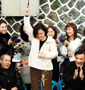 民進黨主席蔡英文(中)昨天前往釣蝦場釣蝦,收了好幾次空竿,在眾人期盼眼神中,她終于釣起第一只蝦子。圖片來源:《臺灣聯合報》