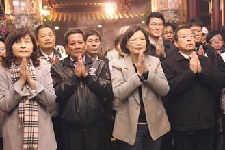 蔡英文(右二)、謝長廷(右一)和云林縣長蘇治芬(左一)昨天一起到云林縣北港朝天宮參拜。圖片來源:臺灣《聯合報》