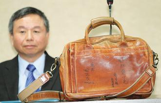臺灣首富、鴻海集團董事長郭臺銘以500萬900元標下前“衛生署長”楊志良用了五年多的公事包,14日上午面交。但郭臺銘在公包上簽下“好膽愛心包”五個字后,又回送給楊志良,等于一字100萬元。郭臺銘說,這次希望拋磚引玉,讓臺灣多幾個有骨氣的政務官。