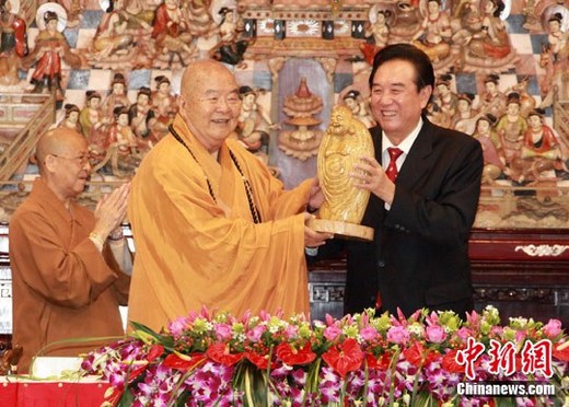2月24日下午,大陸海協(xié)會(huì)會(huì)長(zhǎng)陳云林一行來(lái)到有“南臺(tái)佛都”之稱的高雄佛光山參訪,受到星云法師及僧眾的熱烈歡迎。圖為陳云林(右)向星云法師贈(zèng)送木雕佛像。中新社記者 符永康 攝