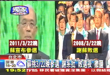 蘇貞昌3月22日晚宣布參加民進黨2012“大選”黨內(nèi)初選,此日正是2008年臺灣地區(qū)領(lǐng)導(dǎo)人選舉謝蘇2人敗選日。圖片來源:臺灣TVBS電視臺