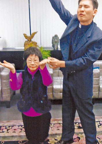牧師許榮彰(右)日前引領呂秀蓮跪地閉眼,雙手高舉。圖片來源:臺灣蘋果日報。