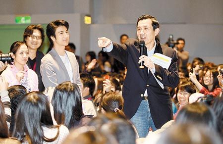 馬英九(右)與歌手王力宏(右二)29日在臺灣清華大學(xué)對談。結(jié)束后2人走到臺下與學(xué)生互動,引起熱烈回響。來源:臺灣《中國時報》