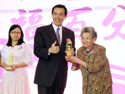 馬英九(中)8日出席在臺中市舉辦的“母愛100幸福百分百─母親節(jié)慶祝活動”,頒獎表揚堅忍卓越的臺灣模范母親。圖片來源:臺灣“中央社”