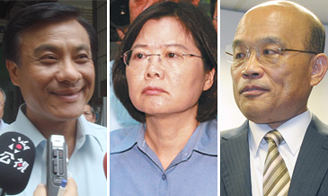 蔡英文(中)副手人選,“雙蘇”蘇貞昌(右)、蘇嘉全(左)浮上臺(tái)面。圖片來(lái)源:臺(tái)灣《聯(lián)合報(bào)》