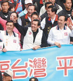 國民黨2012年臺灣地區(qū)領(lǐng)導(dǎo)人候選人馬英九上午和臺灣地區(qū)副領(lǐng)導(dǎo)人候選人吳敦義“合體”在臺中催票,下午,奔回臺北領(lǐng)軍游行,人數(shù)估計超過20萬人;晚間馬英九再深入敵營,殺到臺南舉行造勢晚會,展現(xiàn)連任氣勢。