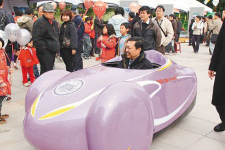 臺灣明道大學研發氫能燃料電池車在“國際燃料電池車觀摩會”上現身相當顯眼,該校校長汪大永在廣場試乘時,引起矚目。圖片來源:臺灣《聯合報》