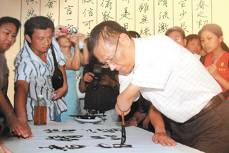 中國臺灣網7月12日消息 據臺灣《聯合報》報道,大陸著名無臂書法家鄭階平,特別委托臺灣資深軍事記者姚琢奇,將親筆揮毫的字畫“中華久遠”轉贈馬英九。姚琢奇轉述鄭階平的話說,“希望中華文化源遠流長”。
