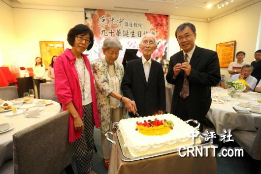 中山大學(xué)校長鄭英耀(右一)與文壇大師余光中、夫人范我存、余光中女兒一齊切蛋糕祝壽。(中評社 高易伸攝)