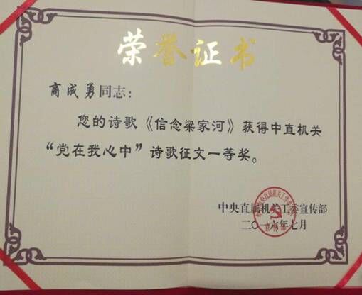 由商成勇創(chuàng)作的《信念梁家河》日前獲得中直機關“黨在我心中”詩歌征文一等獎。在收到獲獎證書后,他激動地說:“這個分量很重的證書,說明謳歌時代、謳歌黨、謳歌我們黨的干部在艱難困苦環(huán)境中堅定信念,帶領群眾努力脫貧的奮斗精神受到肯定。同時,主旋律與正能量作品永遠有市場和受眾。”