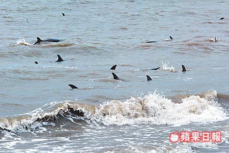 中國臺灣網9月22日消息 臺北縣八里臺北港堤防外的沙灘上,昨天中午有6只熱帶斑海豚集體擱淺死亡,相關單位到場時,還有30只海豚在外海徘徊,海巡人員擔心海豚再度集體擱淺,在岸邊戒護,但仍有一只海豚沖上岸,海巡人員趕緊將它送回海里。但昨晚這群海豚又再度沖上岸,其中3只擱淺死亡,17只被海巡人員送醫(yī)救治,另外有10只則被推回海里。