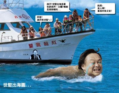 此外,連海報上的對話都成了網友展現KUSO(惡搞)的地方,上面寫著:“阿爸真的有世堅!”“孩子!世堅出海是要告訴我們,白爛加嘴炮是會倒霉的!保ㄖ芟龋