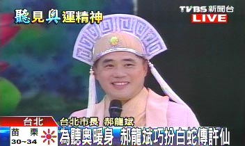 為聽障奧運會熱身,臺北市長郝龍斌粉墨登場扮許仙。來源:臺灣TVBS電視臺